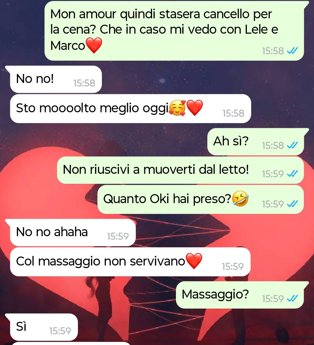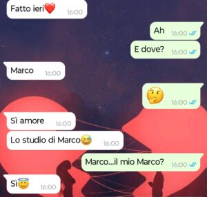 Tutto è partito da una cosa che sembrava banale: Lucia, quella che pensavo essere la mia metà, che si lamentava di dolori muscolari. Io mi preoccupavo, provavo ad aiutarla, sempre pronto a passare in farmacia o anche solo coccolarla e viziarla un po’. Poi ho scoperto che dietro c’era altro. Non ve lo anticipo, ma vi dico solo che quello che ho letto nei suoi messaggi ha fatto crollare la fiducia che avevo in lei in pochi minuti.