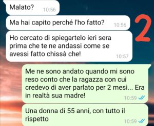 Invece no… parlare con lei mi piace moltissimo. È intelligente, profonda e sa ascoltarmi. Cosa che non mi era mai capitata. Non abitiamo vicino quindi tra una cosa e l’altra siamo andati avanti a scriverci per un bel po’ prima di incontrarci dal vivo. Era soprattutto lei a rimandare sempre, una volta stava per partire per il mare, un’altra aveva altri impegni… pazienza, ho aspettato perché ne valeva la pena. Ho chiesto più volte una videochiamata ma anche quella mi è stata negata, purtroppo. Arriviamo a settembre, le scrivo e le dico che mi sembra arrivato il momento, l’estate è passata. Lei mi dice finalmente che va bene e organizziamo il nostro primo incontro.