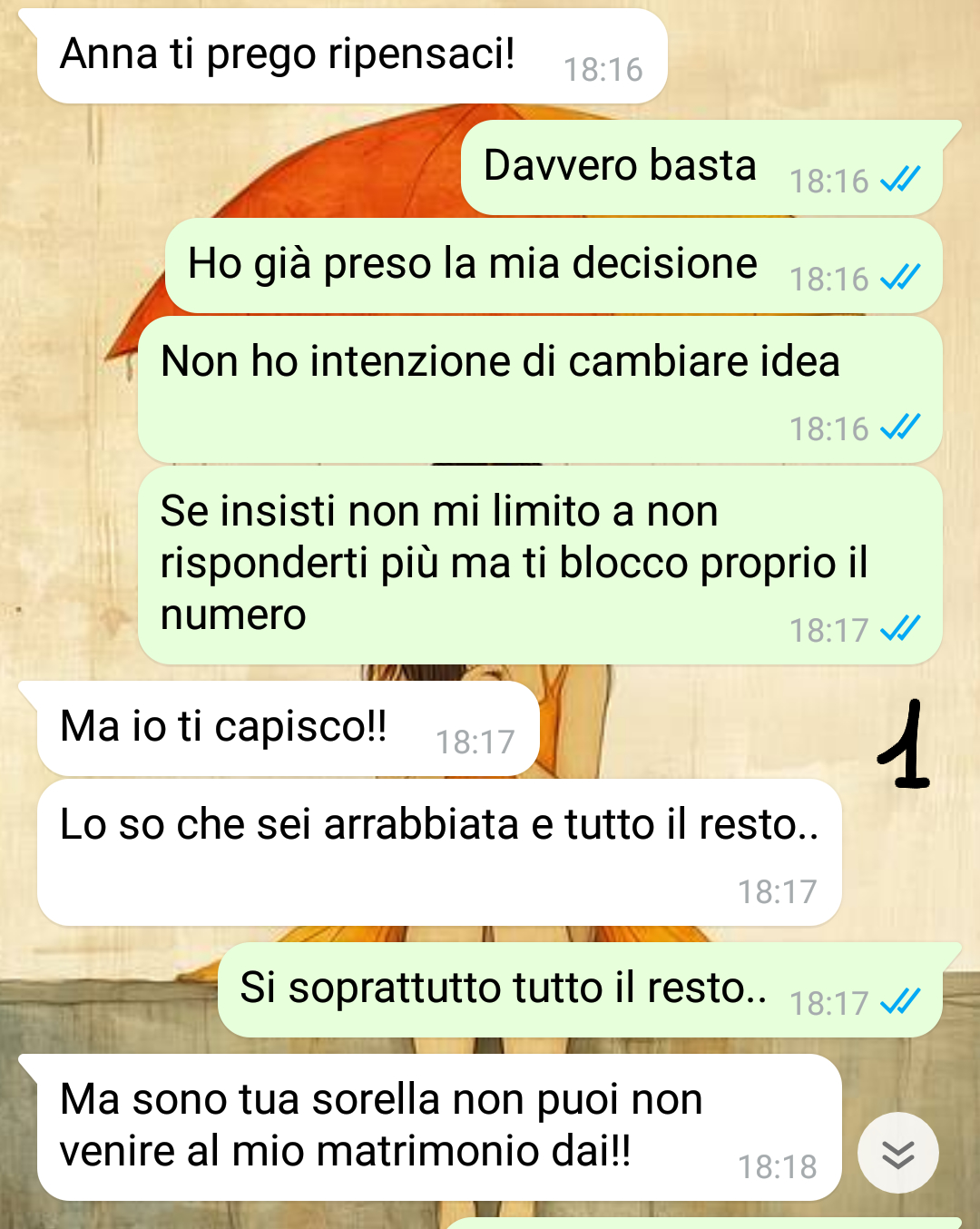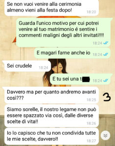 “Ciao SpunteBlu, mi chiamo Anna e ho una sorella che si chiama Antonia. Io e mia sorella abbiamo solo 1 anno di differenza – è lei quella più giovane – e siamo cresciute in simbiosi, anche grazie alla vicinanza delle nostre età: infatti tutti credevano che fossimo gemelle!! Sin da piccolissime, quindi, abbiamo condiviso tutto.. anche se forse più che condividere si è sempre trattato di un “aprire la strada” a mia sorella: io affrontavo sempre le cose e lei andava a rimorchio! Per questo forse lei ha scelto quasi naturalmente di avere i miei stessi amici, di fare gli stessi sport e passatempi, di frequentare le stesse scuole sia alle superiori che all’università… abbiamo infatti studiato sempre le stesse cose condividendo libri e appunti… Poi con l’età adulta le cose sono cambiate e un po’ ci siamo allontanate: io ho trovato subito lavoro, mi sono sposata e ho avuto un figlio, mentre Antonia ha deciso di andare a lavorare all’estero per qualche anno e ha continuato felicemente la sua vita da single… Qualche anno fa è poi tornata a casa e, per la felicità dei nostri genitori, ha finalmente trovato un lavoro fisso qui. Il nostro rapporto tra sorelle però ormai non è più quello di un tempo e io davvero a volte mi chiedo come abbiamo potuto essere tanto unite in passato. Tra poche settimane Antonia si sposa. E io non andrò al suo matrimonio. Leggete perché…”