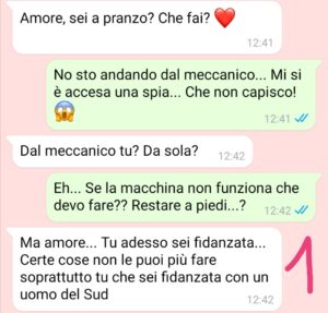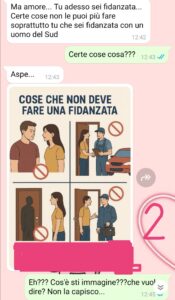 Ora vi lascio leggere tutto…ma chiedo a voi: è possibile una cosa del genere? Davvero ora le coppie funzionano così? Davvero noi abbiamo una differenza culturale per via delle regioni di appartenenza??? Perché io non sono d’accordo con la sua decisione…ma nemmeno con la sua visione della coppia. Sfugge qualcosa a me? Sbaglio io??? Aiutatemi vi prego!”