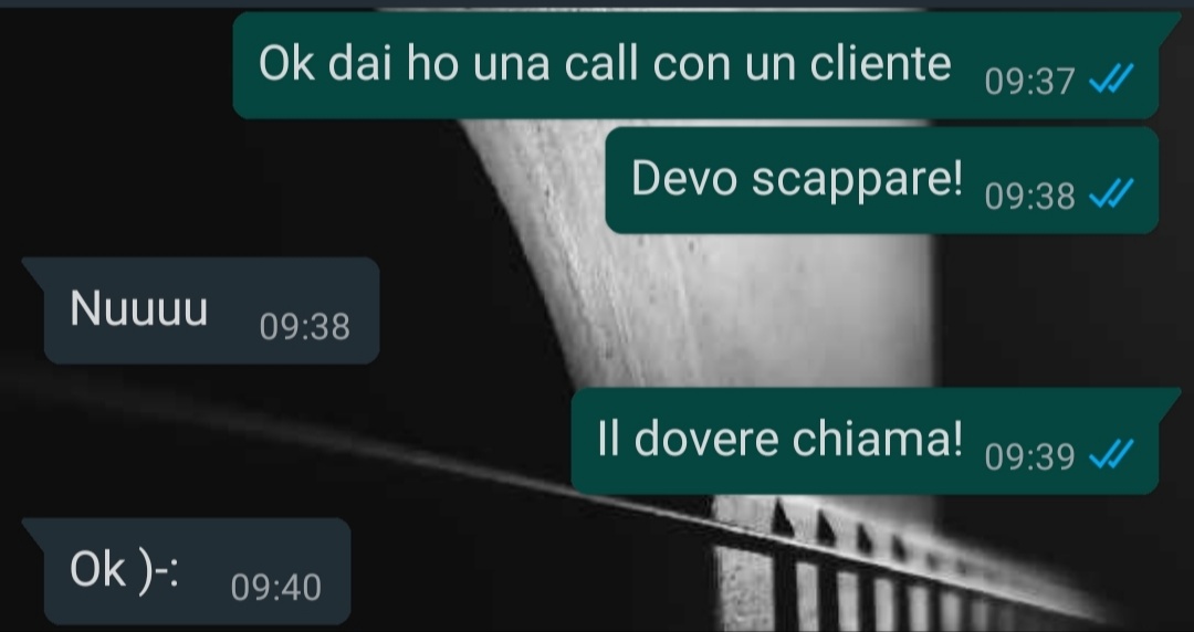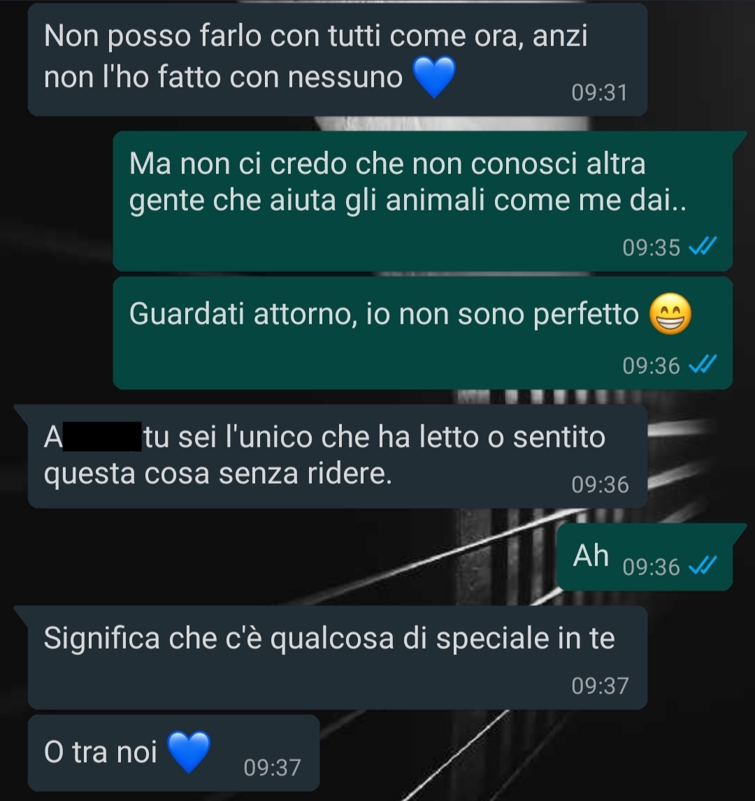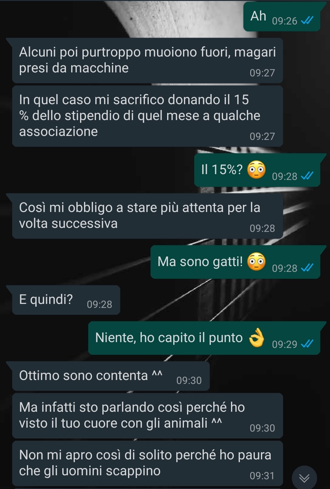 “Finalmente la verità era venuta a galla: era una di quelle fissatissime maniacali e mistiche della peggiore specie! Io ero imbarazzato perché proprio le ultime cose che aveva detto erano fuori dal mondo, e però lei era convinta che io fossi d’accordo! Nel dubbio di dove potesse andare la conversazione me la sono svignata, e durante il giorno ho scritto solo qualche cosa banale. La mattina dopo però apro whatsapp e capisco che la faccenda era ancora più delirante!!”
