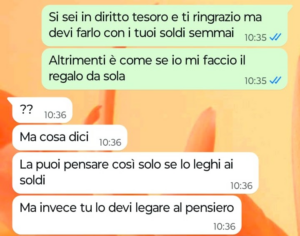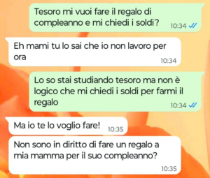 “Buongiorno Spunte Blu, oggi vi scrivo per condividere con voi un piccolo grande dolore per me. Tra poco sarà il mio compleanno, io sono mamma di due figlie splendide solo che stamattina mia figlia più piccola, Anna, mi ha giocato un colpo basso colpendomi veramente al cuore. Contrariamente a sua sorella più grande che si chiama Lorella, Anna non lavora e vive ancora a casa con me. Ebbene mia figlia stamattina mi ha chiesto una cosa incredibile riguardo il giorno del mio compleanno, un giorno in cui io ho organizzato un pranzetto solo donne, insieme alle mie due figlie, a mia madre e a mia sorella. Oggi ero in ufficio quando ho ricevuto la richiesta di mia figlia Anna, con tanto di motivazioni e ragioni specifiche per cui Anna mi ha chiesto una cosa del genere. Insomma, oggi ho scoperto che mia figlia più piccola odia sua sorella, sua nonna, sua zia e con ogni probabilità odia anche me. Ringrazio in anticipo chi sarà così gentile da leggere la mia conversazione con mia figlia Anna di stamattina e darmi magari dei consigli o degli spunti di riflessione che possano aiutarmi a gestire lei, ma soprattutto a capire il suo punto di vista senza lasciarmi ferire così. Io non comprendo davvero dove ho sbagliato come madre, perché a questo punto sicuramente ho sbagliato io qualcosa di veramente grosso per ridurre Anna a pensarla così ad oggi rispetto la sua famiglia…”