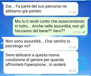 L’altro giorno poi…l’ennesimo affondo su una questione assurda e io non ci ho visto più! Ho deciso di parlare chiaramente con mia moglie e questo è quanto sta succedendo nella mia famiglia. Vorrei un parere perché so di non essere l’unico a pensarla così. Fermiamo tutto questo! Per favore”