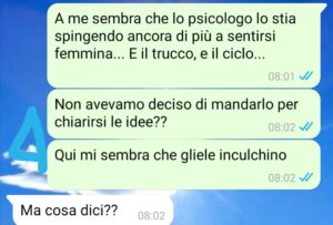 Alberto, mio figlio, ha sempre preferito i vestiti femminili a quelli maschili e giocare con altre bambine con bambole, Barbie, cucina ecc…mia moglie ha sempre sottovalutato questi comportamenti ma io no. Io avevo già capito. A 13 anni ci ha detto che si era innamorato del suo vicino di banco. Un maschio.