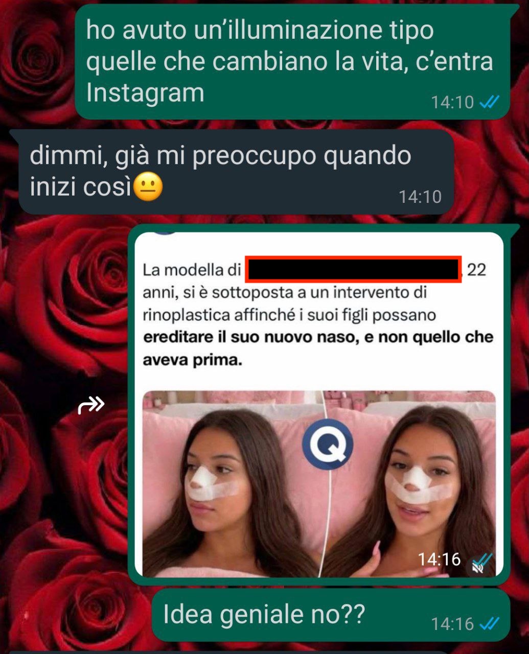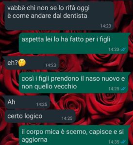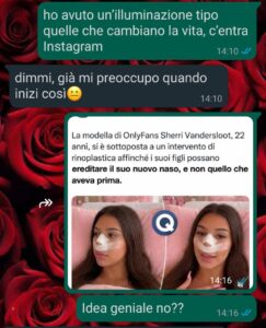 Un giorno ho visto una storia su Instagram. Una ragazza spiegava che si era rifatta il naso prima di avere figli, così loro avrebbero ereditato la versione migliore. Non quella vecchia.