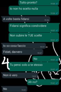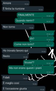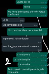 “Ci sono messaggi che ti cambiano la giornata, e altri che ti cambiano la vita. Il suo è stato uno di quelli. Era partito dicendo che sarebbe stato via per poco, giusto il tempo di una riunione, e io mi ero fidata. Poi quelle parole secche, impossibili da confondere: “Non torno”. Credevo fosse uno scherzo, invece era già tutto deciso. Piani presi da solo, senza di me, come se io fossi una comparsa da trascinare a fine spettacolo. Ogni frase apriva un nuovo capitolo che non avevo scelto: decisioni improvvise, certezze spazzate via, condizioni messe sul tavolo come se l’amore potesse funzionare a colpi di ultimatum.