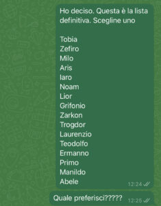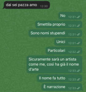 Quindi sì: decido io e voglio decidere il nome migliore per mio figlio. Perché è mio il battito che sente. È mia la voce che riconoscerà prima di tutte!! E se c’è una cosa che non permetterò mai, è che qualcun altro scelga per lui… No, nemmeno suo padre. E quindi niente, litighiamo in continuazione!