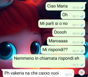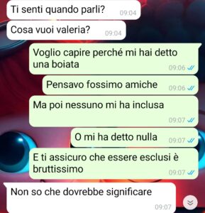 “Si dice che le dinamiche di gruppo funzionano in modo diverso rispetto a come funziona avere a che fare con le singole persone, e io una cosa del genere la so molto, ma molto bene. Sono Valeria e ho avuto di recente a che fare con un tipo di persona con la quale avrei preferito evitare, ma che si è comportata male e per un motivo assurdo. Una persona che io consideravo amica e fedele, ma che mi ha pugnalata alle spalle. Dovete sapere che sono in un gruppo su Whatsapp con un tot di persone con le quali mi sono sempre trovata benissimo. Uscivamo insieme, facevamo tante cose insieme e c’erano i compleanni. Ora, è arrivato un sabato (lo scorso) in cui io ho chiesto cosa avremmo fatto quel giorno che arrivava e prima non mi risponde nessuno, poi la diretta interessata, Maria che è una che in confronto la capoccia delle bulle americane è niente, mi ha risposto, ma non come avrei creduto. Vengo a sapere qualcosa che non avrei voluto ed ecco che la domenica contatto sta persona e le chiedo spiegazioni per le sue azioni.”