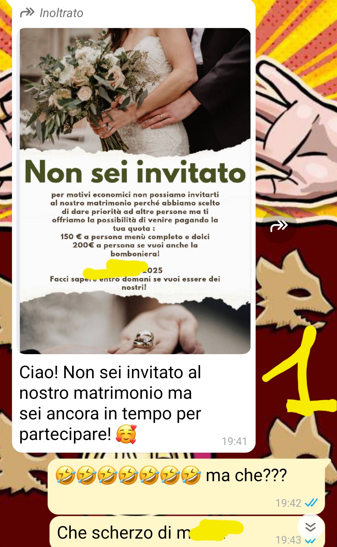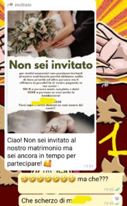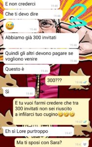 “Ciao spunteblu, mi chiamo Lorenzo e sono appena stato “Non invitato” al matrimonio di mio cugino. Ne avevo viste tante di cose strane ultimamente, ma questa ha superato di gran lunga ogni possibile previsione. Mio cugino mi ha scritto per dirmi che non sarei stato tra gli invitati al suo matrimonio. E questo già potrebbe risultare molto triste e offensivo, se considerate che siamo cugini di primo grado e siamo cresciuti insieme. Il problema vero è che mio cugino purtroppo ha sempre avuto relazioni tossiche in cui le sue fidanzate lo hanno trattato come una pezza da piedi per poi lasciarlo per un altro. Ne ha avute almeno 3 di ragazze così, e adesso ha deciso di sposare Sara, una sua ex compagna di scuola che è la tossicità fatta persona. A Sara non è mai piaciuta la nostra famiglia e la cosa è sempre stata reciproca. Ovviamente, per il matrimonio, ha deciso tutto lei…e infatti è andata a finire nel modo peggiore…”