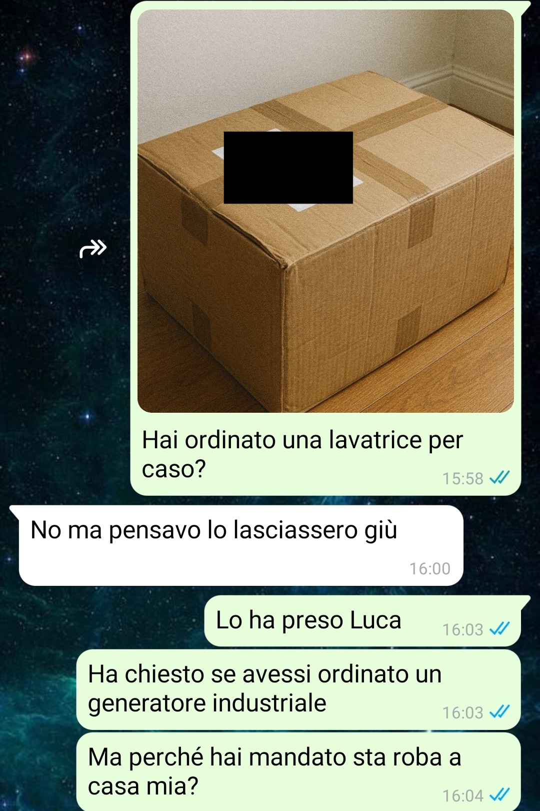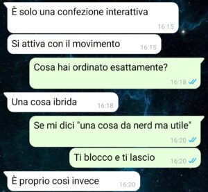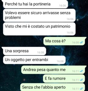“Ciao, io sono Martina e questa volta il mio fidanzato ha veramente superato ogni limite, vi mando questa conversazione perché onestamente non so più se sto con un ragazzo o con uno sceneggiatore di serie sci-fi per adulti. Andrea, il mio fidanzato, ha deciso di ordinare un oggetto “originale”, a metà tra un gadget nerd ed un oggetto per la coppia. Fino a qui nulla di troppo strano se non fosse che non mi ha detto nulla, ovviamente e che ha pensato bene di farlo recapitare a casa mia, dove vivo con altre persone, tra cui Luca, che adesso usa il contenuto del pacco per prendermi in giro costantemente, è un incubo. L’oggetto in questione ha led, una ventosa, può essere comandato da remoto con un app ed ha una specie di occhi. Vi giuro che non sto inventando niente. Anzi: sto tralasciando i dettagli peggiori. Vi allego la chat con tutti gli screenshots anche per capire il comportamento del mio ragazzo che deve baciare terra per ringraziarmi del fatto che non lo abbia lasciato. Forse leggendo capirete perché ora quando mi chiamano dalla portineria io tremo.”