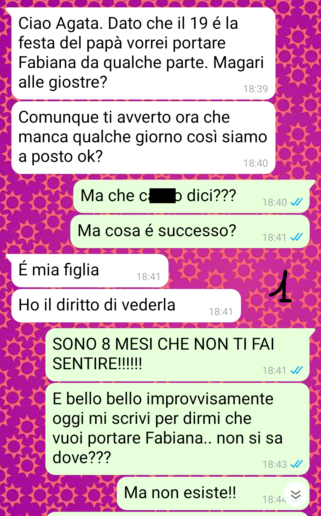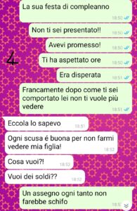 L’ultima volta è stato per il compleanno di Fabiana: aveva promesso che sarebbe andato a prenderla, avrebbero passato qualche ora insieme e poi l’avrebbe portata alla festa di compleanno. Bene.. non si è presentato e non ha neanche chiamato per scusarsi o dire buon compleanno a sua figlia! È semplicemente sparito!!