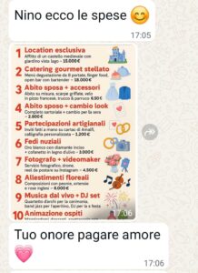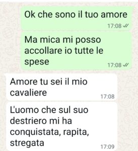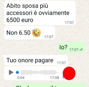 Marianna in questa chat che vi mando ha cercato di convincermi che pagare soltanto io sia la soluzione migliore, per non litigare, per rispettare una tradizione della sua famiglia.