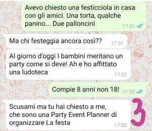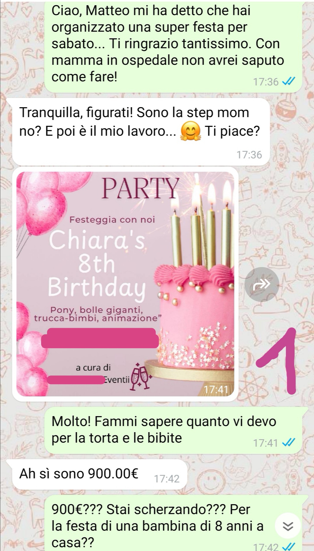 Ho cominciato a correre avanti e indietro e non avevo tempo di organizzarmi per la sua festa di compleanno. Chiedo allora una mano al padre, siamo divorziati da 5 anni. E a lui viene in mente di delegare tutto a sua moglie che fa proprio questo di lavoro, organizza feste.