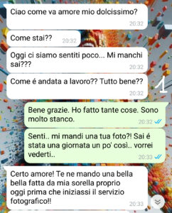 “Care SpunteBlu, mi chiamo Alessandro, e vi dico proprio il mio vero nome perché in questa storia io ho deciso di metterci la faccia!! Un po’ francamente mi vergogno perché la situazione è umiliante per me, ma ho pensato che raccontando quello che mi è successo è possibile che io aiuti qualcuno a fuggire a questa truffa oppure, se chi mi legge ha vissuto la stessa cosa, il mio racconto lo possa consolare e gli permetta di superare la vergogna e il dispiacere per quello che gli è successo. Perché nessuno vuole sentirsi stupido e meno che mai l’unico stupido!! Allora tutto è cominciato un anno fa. In un sito di appuntamenti ho conosciuto Michelle. Lei mi ha detto di essere italo americana e di vivere nei Caraibi. Abbiamo iniziato a scriverci… la distanza geografica che ci separava mi aveva anche rassicurato: che poteva succedere di brutto se l’altra persona stava a migliaia e migliaia di chilometri da me?? Con il tempo siamo diventati amici… e poi qualcosa di più! Lo ammetto mi sono innamorato come uno scemo di una persona che non avevo mai visto!! Ma io ero così convinto della sua buona fede che non mi ha fatto neanche strano quando lei mi ha chiesto dei soldi… Leggete la nostra ultima conversazione, quando tutta la verità è venuta a galla…”