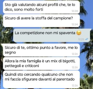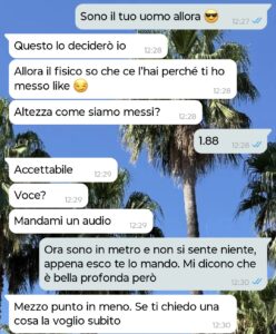 Ovviamente il candidato doveva avere tutta una serie di requisiti fisici, lavorati ecc per essere anche solo preso in considerazione che non vi dico, quindi non mi sono potuto far scappare questa occasione. Abbiamo matchato, lei mi ha scritto il suo numero e questa è la conversazione che ne è uscita.