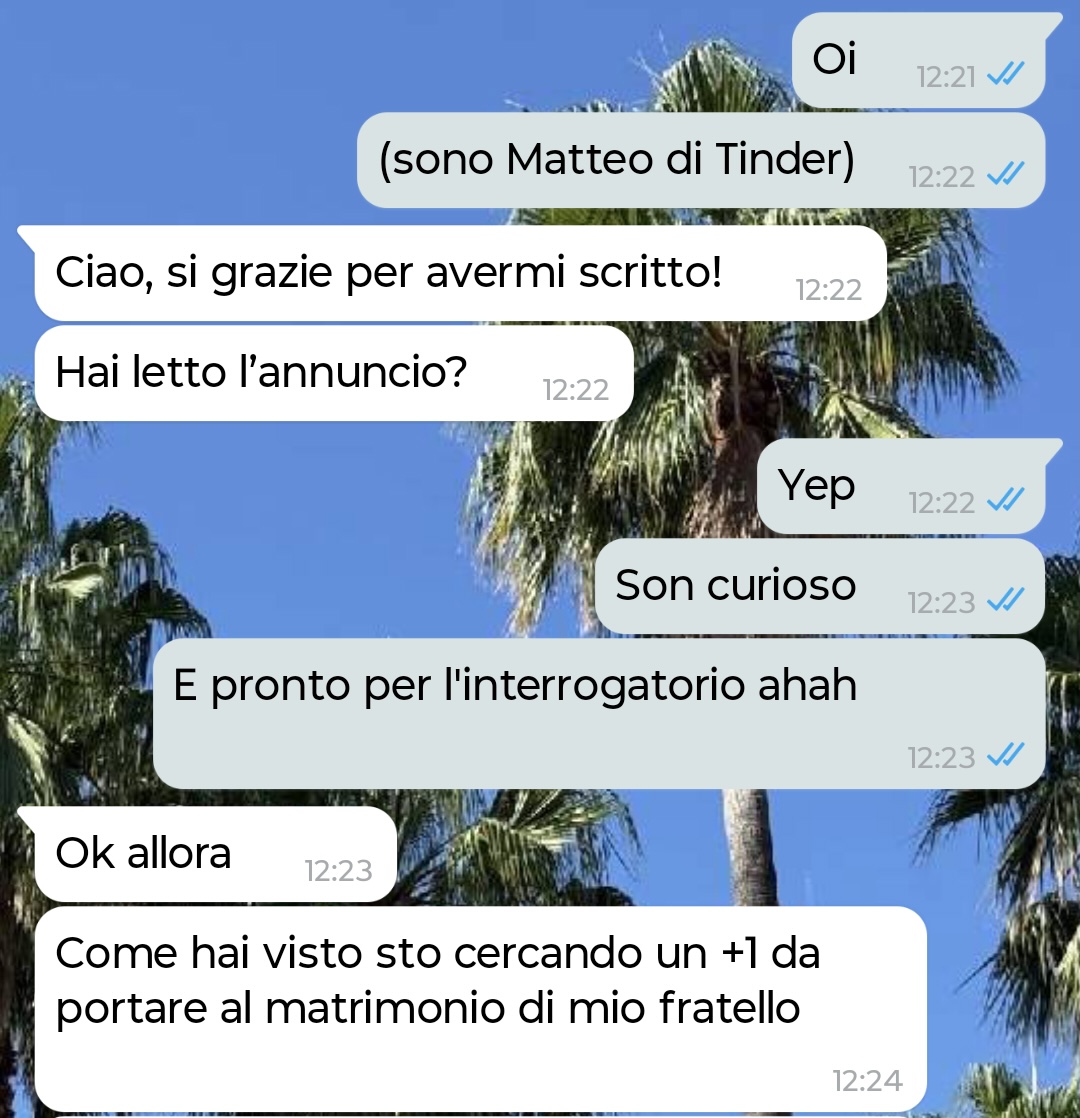 “Ciao a tutti, prima di presentarmi vi do il contesto: qualche giorno fa ho letto un annuncio assurdo di una tipa che cercava il più uno da portare al matrimonio del fratello su una app di incontri.