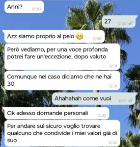 Ovviamente il candidato doveva avere tutta una serie di requisiti fisici, lavorati ecc per essere anche solo preso in considerazione che non vi dico, quindi non mi sono potuto far scappare questa occasione. Abbiamo matchato, lei mi ha scritto il suo numero e questa è la conversazione che ne è uscita.