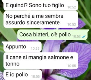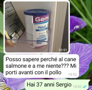 No. È che secondo lui il cane mangia bocconi di salmone e tonno, mentre lui viene “portato avanti col pollo”.