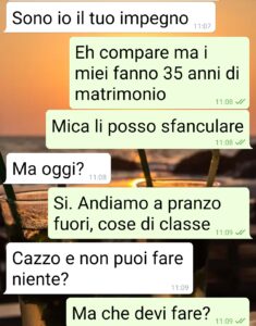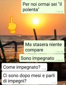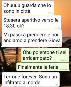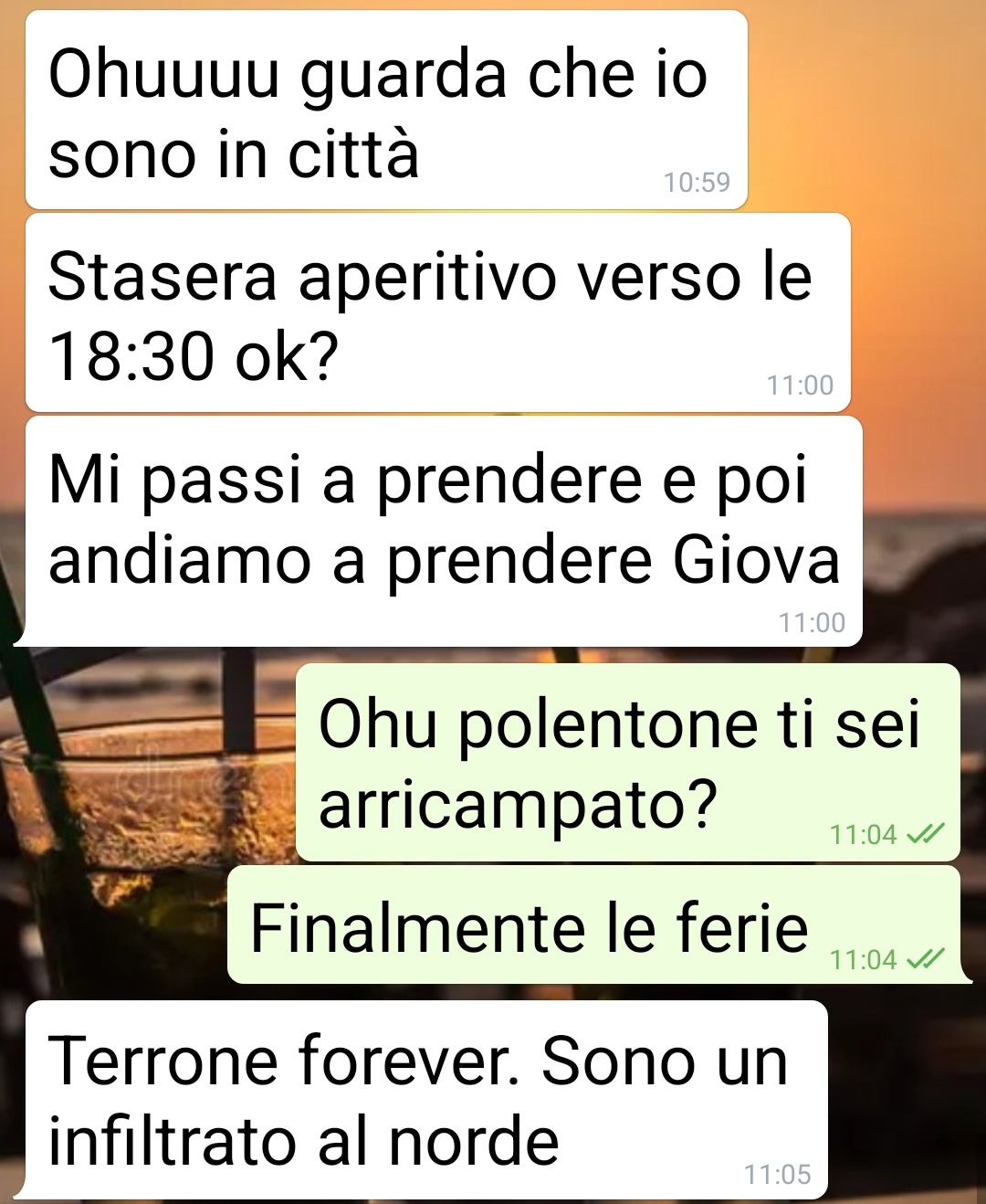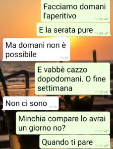 Ciao spunte blu, queste è una di quelle cose strane che ti capitano. Che non capisci il perché, che anzi il motivo non esiste proprio, ma che ti porta a rivalutare le persone. Persone che credevi di conoscere e che invece no puoi fare altro che rivalutare. I peggio naturalmente. È il caso di questo mio amico, che onestamente non so più se definire tale. Lavora da qualche anno al nord e quando torna nel nostro sud ci vediamo ovviamente. Amici dalle medie… non ti organizzi anche prima di prendere l’aereo? Questo invece mi scrive solo la sera prima di partire. Dopo che sta qua da settimane, come poi ho scoperto. E io sarei in torto perché non posso fare l’aperitivo con lui! Leggete che chat incredibile e che cosa ho scoperto. Altro che impegni e che andata così e che ci tiene a vedermi… E ripeto il motivo di tutto questo non esiste!”