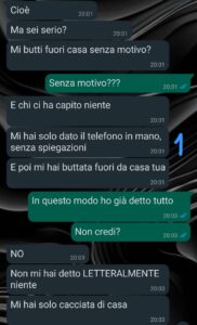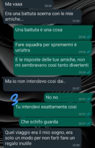 Ho cercato di non far pesare certi episodi, anche se dentro di me hanno lasciato un segno. Come quella volta in crociera con le amiche: mentre mi mostrava distrattamente delle foto, ne è apparsa una in cui ballava fin troppo avvinghiata con un cameriere. O quando, in un’altra occasione, era fuori città e doveva tornare entro le otto, invece alle 22:20, dieci minuti prima che scendessi a prenderla come da accordi, mi scrive che sarebbe rimasta a dormire lì. Una mossa perfetta per impedirmi di organizzare la mia serata, visto che odia se esco senza di lei.