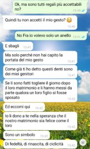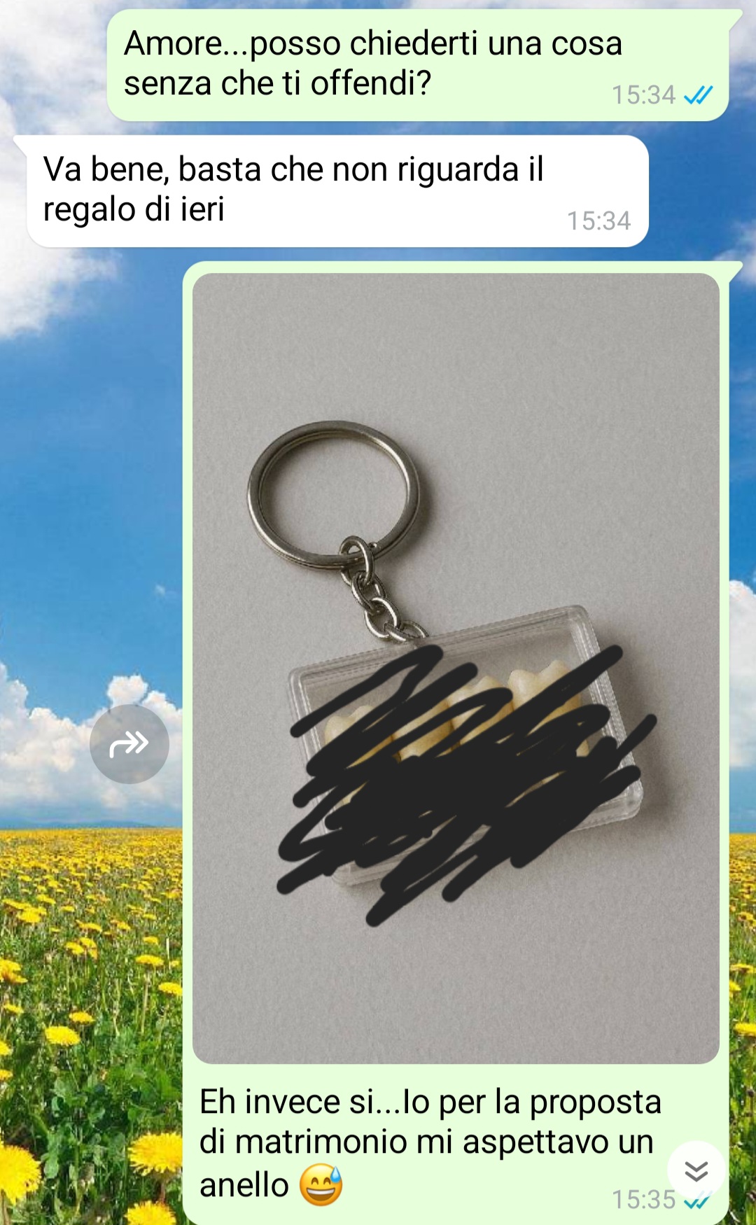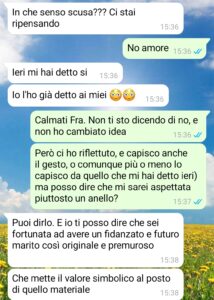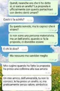 “Mi sono sempre detta che mi piacciono le persone strane, quelle che non fanno le cose “come tutti”. E infatti quando ho conosciuto Francesco, tre anni fa, mi sono innamorata proprio di questo: la sua testa fuori dagli schemi, le sue idee assurde, il modo in cui riusciva a rendere profondo anche il discorso più banale. È uno di quelli che ti spiega perché il caffè è un gesto politico, o come il Natale sia una costruzione del capitalismo affettivo. A volte lo prendo in giro, ma in fondo mi diverte. Perché anch’io sono così. Non mi piacciono le tradizioni e amo le cose fuori dal comune. Solo che questa volta… no. Questa volta ha superato il limite. Anche relativamente ad una proposta di matrimonio, va bene tutto, va bene l’originalità, va bene il fare un qualcosa di diverso. Ma se la persona che ami ti chiede di sposarlo, ti aspetti comunque un gesto simbolico, qualcosa che ti faccia tremare le mani, che ti resti addosso. Ecco, l’unica cosa che ho tenuto è il tremare, per ragioni che saranno presto ovvie. Non sapevo che fare, ma ho fatto l’unica cosa che mi pareva giusta…”