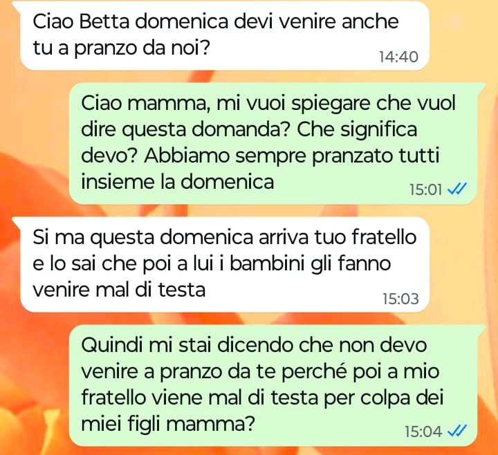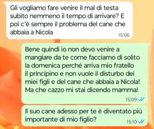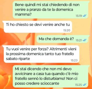 “Buongiorno Spunte Blu, se volete conoscere la mamma più buona e affettuosa che esiste sulla faccia della terra non dovrete far altro che leggere la mia chat e conoscerete mia madre, una donna che si è sempre fatta in quattro per me al punto da trasformarmi nella sua serva personale, trattata sempre a pesci in faccia (sia me che i miei due figli piccoli e pensare che sono anche una mamma single), mentre mio fratello viene costantemente trattato come un principe supremo nonostante se ne sia sempre fregato altamente di lei. Leggere per credere! “
