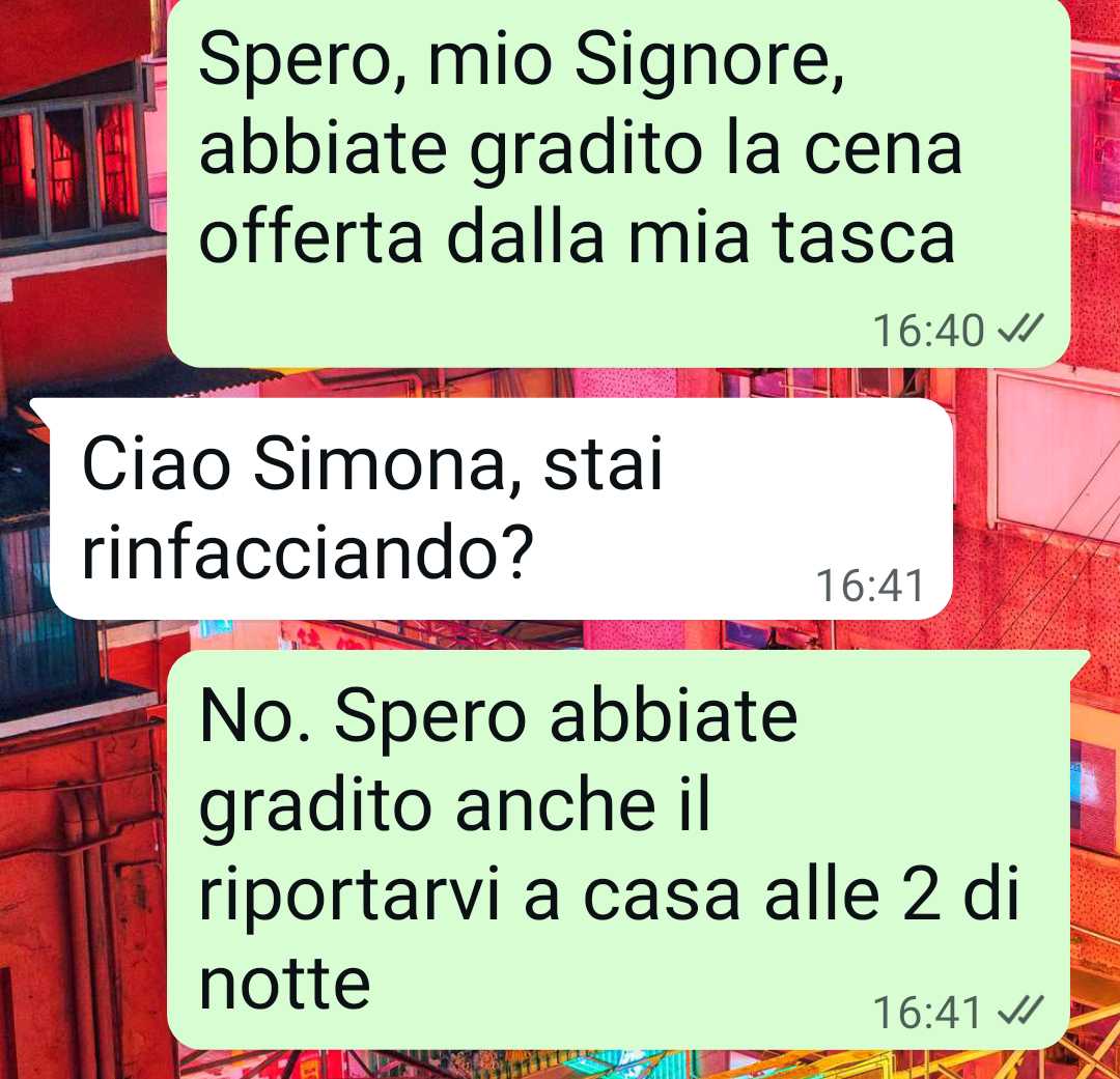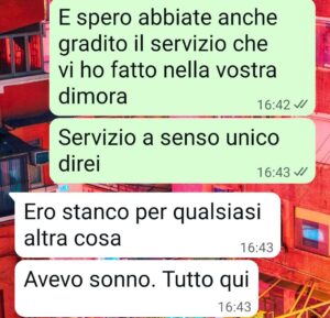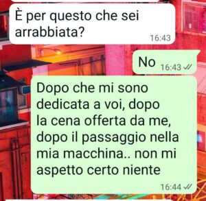 Certo i segnali c’erano già dall inizio, una certa propensione a comportarsi da nobile e a trattare gli altri come servi della gleba, che devono pagare il loro tribulo al signore del feudo. Quindi ok a scrocchi vari di cene, a passaggi con la macchina. Ma quando poi, una sera a casa sua, ci siamo ritrovati io, lui e sua madre, beh, non ce l’ho fatta più…”