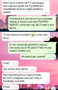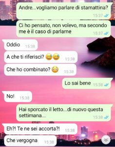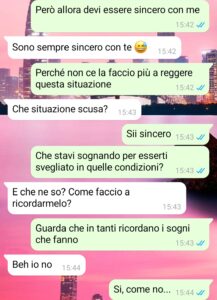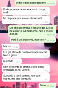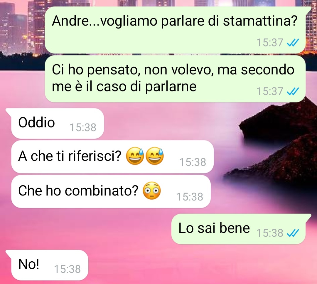 “Ok lettori…prima che io impazzisca da sola, devo assolutamente raccontarvi quello che mi è successo con quello che è stato, negli ultimi due anni, il mio fidanzato. Una persona buona, una persona gentile, una persona che io amavo, ma amavo davvero. Ma questo non è importante, per qui non si parla di me, ma si parla di lui, ed è proprio questo il motivo per cui tutti i problemi sono iniziati: ci sono i problemi della coppia, e questo è normale, e poi ci sono i problemi dei singoli, e i problemi dei singoli non sempre si possono risolvere in coppia, ma bisogna fare pace con il cervello. I primi tempi le cose andavano bene, molto bene, tanto che dopo un anno siamo andati a vivere insieme. Sono continuate ad andare bene fino a che, dal nulla, i momenti intimi tra di noi, progressivamente, sono diminuiti, fino a scomparire del tutto. Al momento della chat, erano tre mesi che non succedeva nulla, ed essendo giovani e in una relazione relativamente fresca, era sempre più frustrante. Il vero motivo che ha scatenato tutto, però, è che lui, nonostante questa situazione, aveva un problema ricorrente. E allora sono dovuta intervenire.”