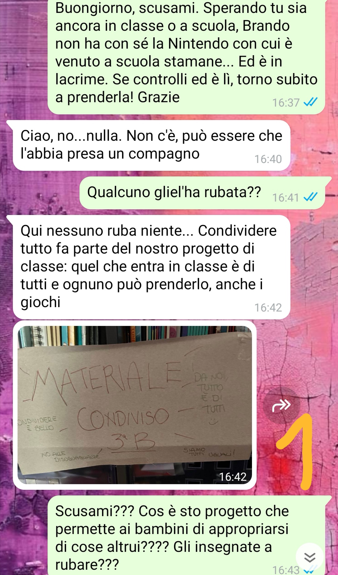 Scrivo subito alla maestra, sperando sia ancora in classe, chiedendole di controllare che se era lì tornavo subito a prenderla.