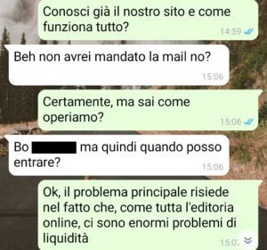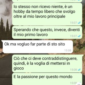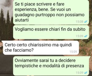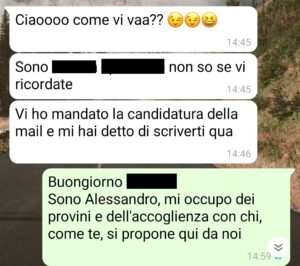 “Salve a tutti, vorrei iniziare questa presentazione cercando di farvi capire che quello che leggerete non rappresenta il mio lavoro, ma il mio approccio alle persone è una strategia comune a tutti i miei colleghi e suffragata dal mio capo che è convinto, a ragione dato che fino a ora tutti si sono trovati bene e nessuno mai si era comportato in questo modo, che sia un buon modo di fare, non vecchio stile, noioso, freddo e impersonale, ma atto a mettere a loro agio le persone. Una comunicazione via cellulare è più simile a quella che si ha con gli amici, è più comoda e permette di essere più rapidi nelle risposte rispetto a una mail. Io mi sono sempre trovato bene e ricoprendo da poco questo mio nuovo ruolo ho avuto ottimi feedback. Forse stavolta l’ho gestita male, ma penso che la persona stesse partendo già con cattive intenzioni. Questo perché ci è arrivata alla mail una candidatura di una ragazza per lavorare con noi (anche se non è un lavoro, ma solo un passatempo) e le ho detto di contattarmi quando voleva su Whatsapp e così ha fatto, ma già avevo capito che c’era qualcosa di strano.”