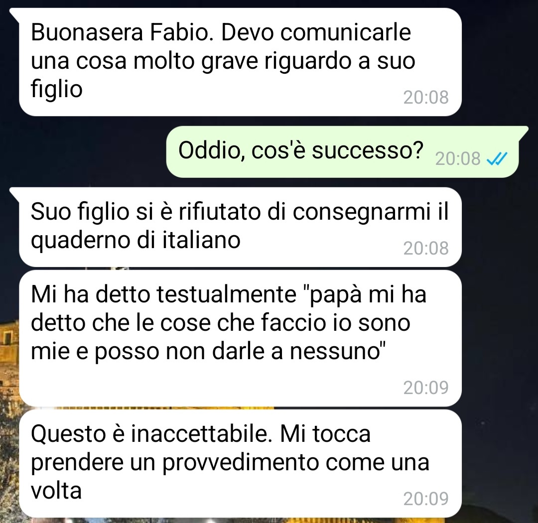 “Oggi voglio condividere con voi una cosa che mi è successa a scuola, e vi avverto… è da pazzi. Mio figlio di 8 anni torna a casa e mi racconta che la sua maestra lo ha rimproverato per una frase che ha detto a scuola… e non per quello che pensate. Io pensavo fosse solo una giornata “difficile” per lui, ma poi la maestra mi scrive su WhatsApp e quello che segue è stato un crescendo di assurdità. All’inizio sembrava solo una discussione su compiti e comportamenti in classe. Poi, a mano a mano, si è scoperto che dietro tutto c’era qualcosa di molto più personale: un rancore antico che la maestra portava nei miei confronti da decenni, e che ha finito per riversare su mio figlio senza neanche rendersene conto. Mi sembra assurdo che al giorno d’oggi le maestre o chi per loro ancora se la credano in questo modo. Oh, fate le maestre, scendete dal piedistallo. E soprattutto smettetela di prendervela ingiustamente con i nostri figli, che se faticano e poi hanno problemi, è colpa principalmente vostra. In ogni caso, qui è stato superato ogni limite.”