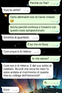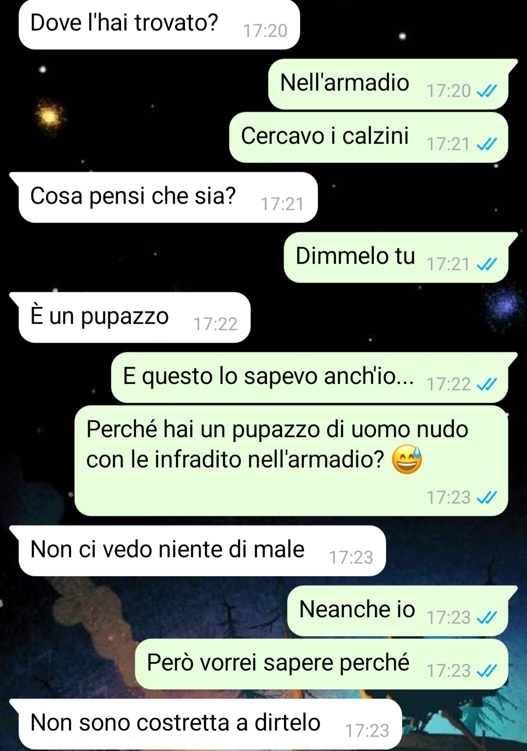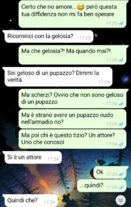 “Buongiorno a tutti. Ho deciso di condividere questa mia chat con Giorgia per dimostrare non solo a tutti coloro, molti tra amici, parenti e non solo, che mi hanno definito geloso in maniera non sana, che ho ragione. Ora voglio che mi dite dove sta la gelosia in quello che ho fatto. Era il minimo che potessi fare considerando la situazione. Ma il rispetto dove ce lo siamo messi? Io sono cresciuto in una famiglia dai valori sani, dove quando si ha un fidanzato o una fidanzata ci si comporta in un certo modo, appunto mettendo il rispetto al centro di tutto. E non credo di essere sbagliato io, né tantomeno di non comprendere la realtà delle cose. Stavo con Giorgia già da tanto ma non avevamo mai convissuto. Era il momento. Lei era già in affitto in una bella casa in centro e dato che è molto grande, e che il prezzo diviso due sarebbe stato ottimo, io mi sono trasferito da lei. Ero a casa sua, lei era a lavoro, e mentre mi riposavo sul letto, ho notato una cosa che non avevo mai visto, pur essendo stato lì più volte. Mi ha subito colpito. Era un pupazzo molto ambiguo. Allora le ho scritto.”