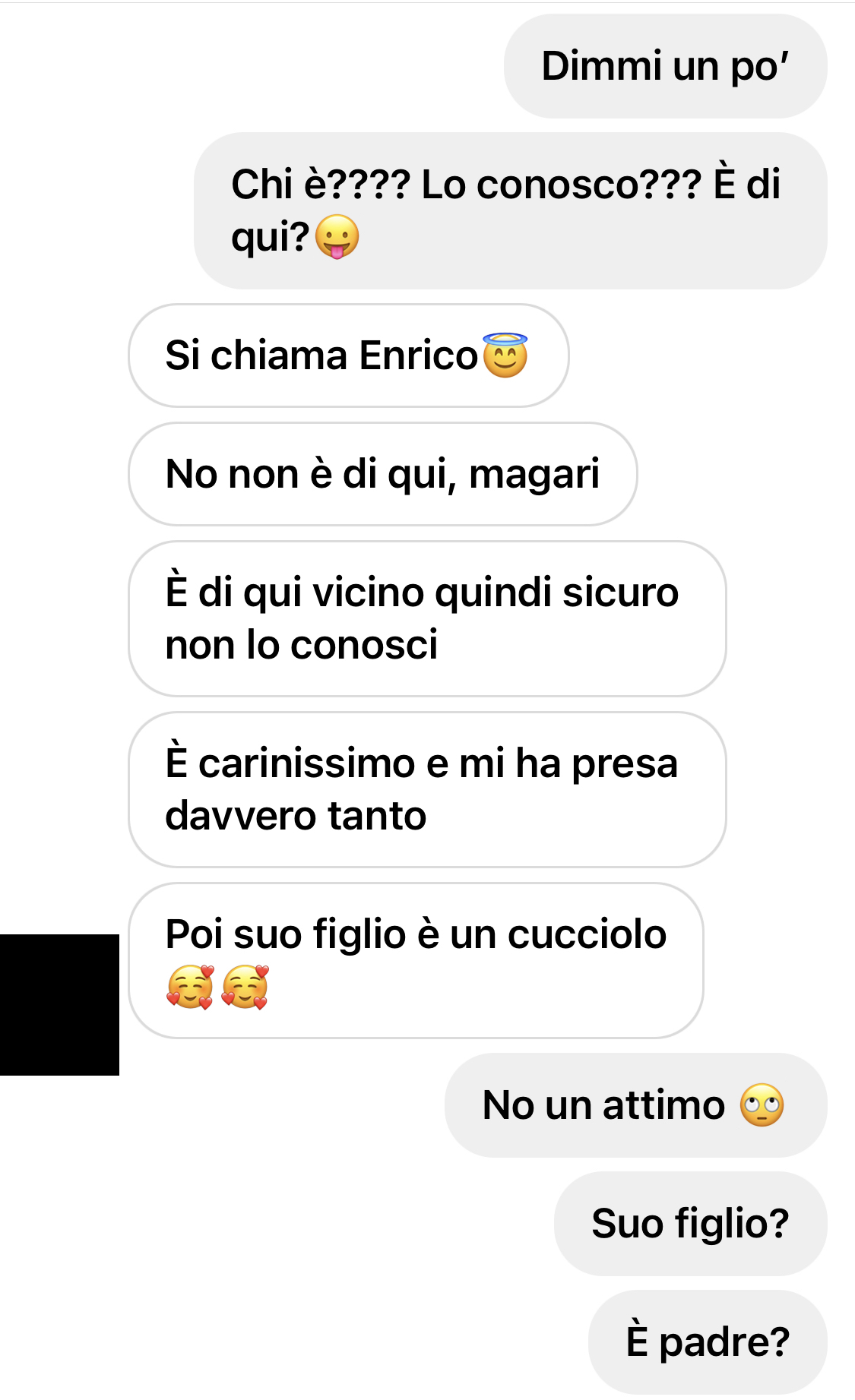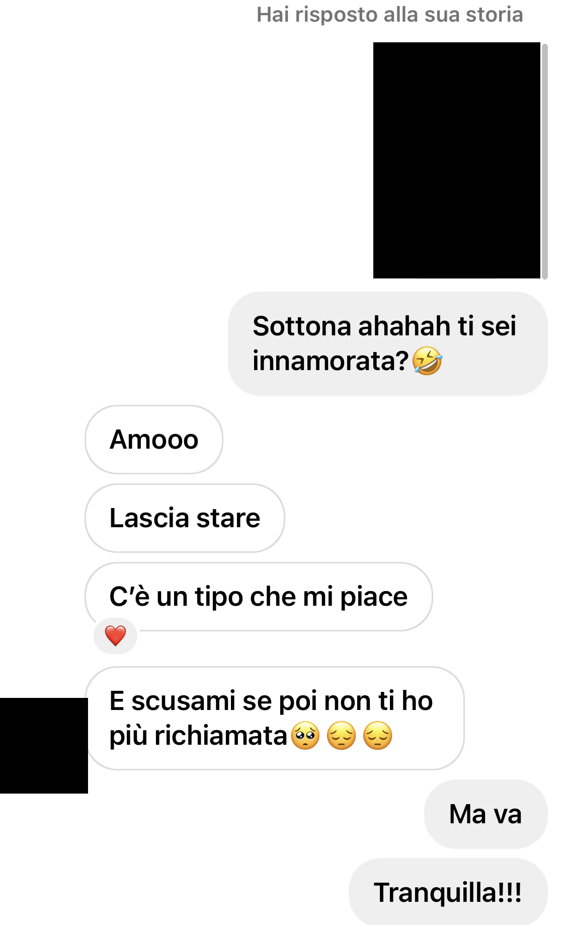 Sembra aver cambiato totalmente il suo pensiero e non so come sia possibile. Entrambe abbiamo 19 anni, ci conosciamo dal 2 liceo e avevamo stretto davvero un bel rapporto, poi per un po’ ci siamo separate ma abbiamo sempre mantenuto i contatti. Le ho risposto ad una storia dove c’era una foto con una canzone d’amore, anche per scherzo le ho risposto in quel modo, non so mi sentivo potesse essere “dedicata” a qualcuno e così è stato.