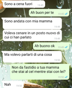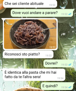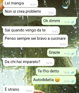 Ora, secondo me è giustissimo fingere un poco all’inizio. Non intendo dire che dobbiamo mandare foto false o che devo dire di essere ricco quando non lo sono o cose del genere, ma se voglio stupire una ragazza che considero perfetta, magari mi industrio per mettermi in tiro. Oltre a questo ci sono altri esempi, ma ve li risparmio. Fatto sta che lei mi aveva detto quanto trovasse attraenti i ragazzi che cucinano qualcosa di buono per la propria ragazza e ho pensato di stupirla in tal senso, invitandola a casa mia e facendole trovare già pronta una cenetta a lume di candela. Peccato che lei dopo pochi giorni ha scoperto che c’era qualcosa dietro…”
