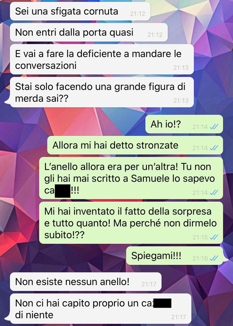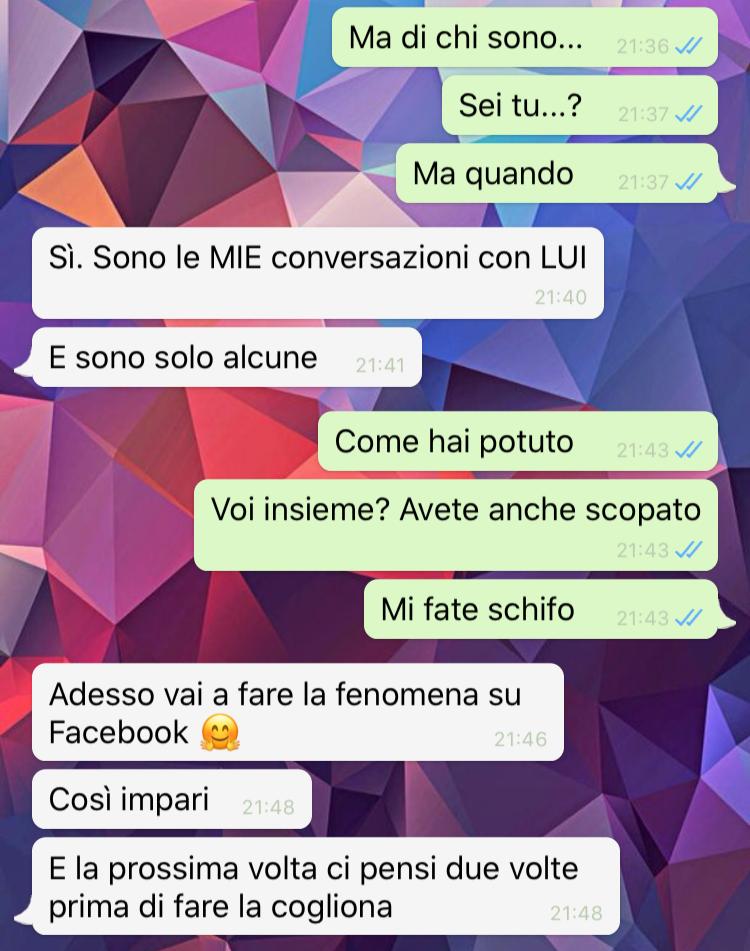 “Ero e sono ancora sotto shock, ho letto screen su screen tra loro due che non riesco nemmeno a descrivere. Stravolta… Ho smesso di rispondere per sempre ai messaggi e tra telefonate e treni sto ancora risolvendo la situazione… Ora mi ritrovo senza fidanzato e senza amica, per fortuna…”