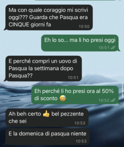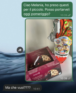 Con lei è impossibile parlare, non so cosa fare… Sono afflitto. Avevo preso un regalo di Pasqua per mio figlio, volevo vedere la sua gioia nel volto mentre scartava l’uovo di Pasqua e invece lei è stata la solita strega cattiva.