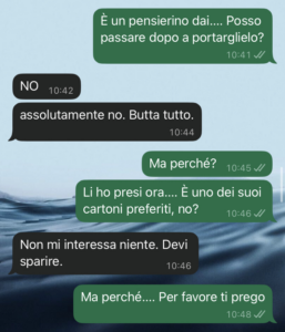 “Ciao pagina di spunte blu, io vi adoro. Oggi ho deciso di condividere con voi la mia storia perché so che tanti papà potranno capirmi. La storia è molto breve… io e la madre di mio figlio non ci parliamo praticamente più perché lei non vuole farmi vedere mio figlio. Me lo impedisce in ogni modo e ovviamente tutto il mondo, le leggi, la famiglia…. Tutto e tutti sono dalla sua parte. È vero che in passato ho fatto i miei errori, come tutti, ma vorrei rimediare eppure lei non me lo permette. Sono sconvolto e sento di star perdendo gli anni più belli e importanti di mio figlio. Vi mando gli screen dell’ultima discussione che abbiamo avuto così capite bene cosa intendo.