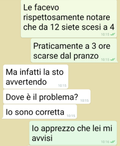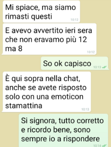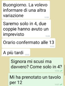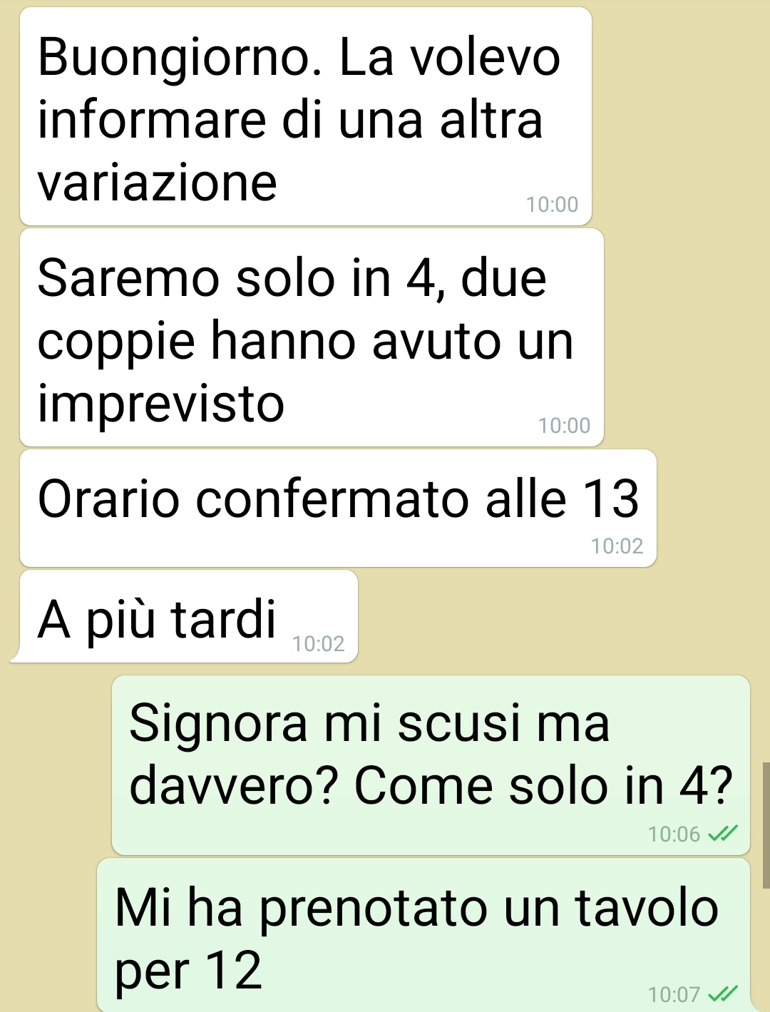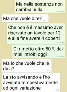 “Lavoro nel ramo ristorazione da 39 anni e ne ho viste di cotte e di crude. Negli ultimi 7 anni le cose però sono decisamente più normali, quindi migliorate. Ho realizzato il mio sogno di avere un locale tutto mio, di qualità riconosciuta e certificata, gourmet ed esclusivo. Gli avventori sono (dovrebbero) essere di un certo tipo. Ma “tizi da spunte blu” ne capitano ancora, come questa signora della chat. Ha prenotato un tavolo da 12 persone (il 60% della capienza del locale) con anticipo (necessario due settimane, per mia fortuna) per dirmi che sarebbero venuti solo in 4. A 3 ore dal pranzo in pratica. Il mio locale è in un attico, con terrazzo, senza insegne o indicazioni per “avventori occasionali”. Lavoro in pratica su prenotazione e in base a quelle taro personale, spesa, menù ecc. Non ho nemmeno orari fissi o giornate fisse di apertura/chiusura. Ma a questa signora non importa nulla di tutto ciò. E si è pure indignata quando ho avuto la fortuna di poter salvare il salvabile.”