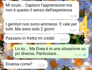 Giunti agli ultimi giorni di allenamento della stagione, l’allenatore ci comunica che hanno organizzato un ritiro di 2 giorni in cui ci sarà un mini torneo e tante altre iniziative, in un posto vicino al lago, che dista qualche chilometro da dove abitiamo. Quindi Enea dovrà passare due giorni intero da solo con la squadra, due giorni lontano da me. E io so che lui non è pronto.