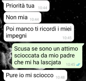 “Ciao Spunte, mi chiamo Nicole e gli ultimi anni per me sono stati tosti. La malattia di mio papà è arrivata senza preavviso e poi quando il medico ha detto “dobbiamo prepararci”, il tempo è diventato un conto alla rovescia fatto di visite, referti, sedie di plastica e corridoi che sanno di disinfettante. Papà all’inizio la prendeva sul ridere, era un uomo forte, io ridevo per non crollare. Non ho mai pensato potesse finire, mio padre era il mio guerriero, ma poi la malattia ha preso spazio: prima poco, poi tutto. E alla fine quando è mancato papà non è rimasto niente solo un vuoto, e dopo il vuoto il “da fare”: documenti, telefonate, condoglianze.. E il mio dover essere forte. Sempre. Ma io volevo solo essere fragile per una volta, con il mio fidanzato Roberto al mio fianco al rosario di papà. Un’ora in cui potevo respirare senza fingere. Avevo bisogno di non sentirmi sola. Avevo bisogno di lui.