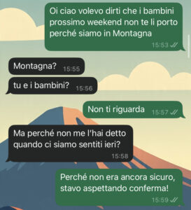 Gli ho detto che avrei portato i bambini in montagna e si è scatenato il caos… solo perché ho confessato un mio piccolo “segreto” riguardo la mia vita privata. Lui non capisce che non c’entra più niente nella mia vita e non deve interessargli!!