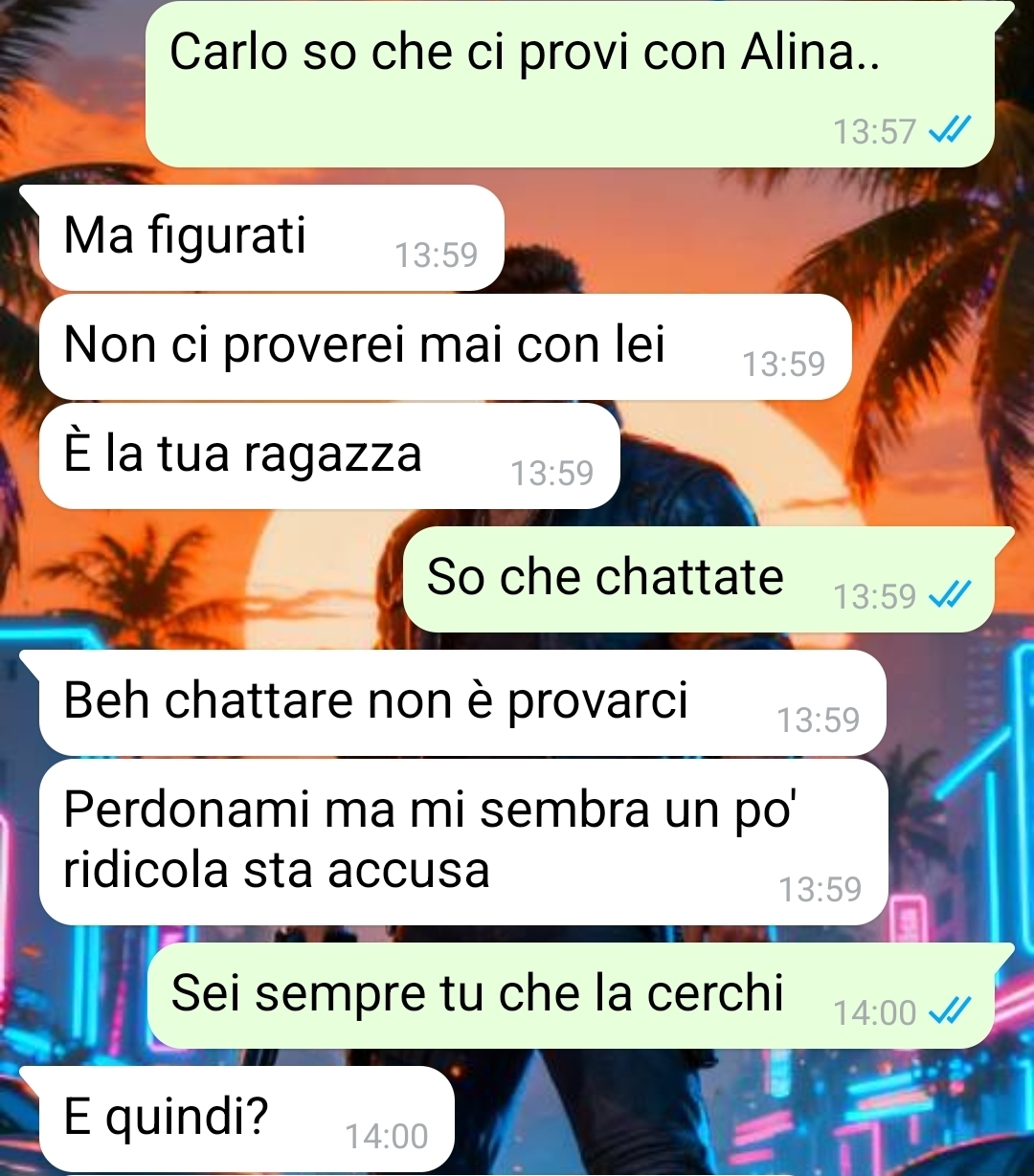 “Cosa fareste se aveste il sospetto che una persona che conoscete ci stesse provando con la vostra dolce metà? Sareste gelosi e fareste la solita e classica scenata di gelosia al vostro partner oppure andreste ad affrontare l’amico in questione? Io, mi chiamo Manfredi, non mi trovo molto nel ruolo del fidanzato geloso marcio che deve comportarsi in modo tossico e pesante. Non sono così. E infatti mi fido totalmente della mia ragazza, Alina, che mi ha oltretutto parlato e spiegato che c’è una situazione un po’ strana con Carlo, sto ragazzo che conosciamo. Un mio amico, uno che ne ha passate tante e che ora sta dimostrando di non essere degno di fiducia. Ho voluto affrontare la questione e possiamo dire che non è andata benissimo. Ma andiamo per gradi. Io e Alina stiamo insieme da quasi un anno e solo di recente, da un mesetto, l’ho presentata alla mia comitiva di amici.