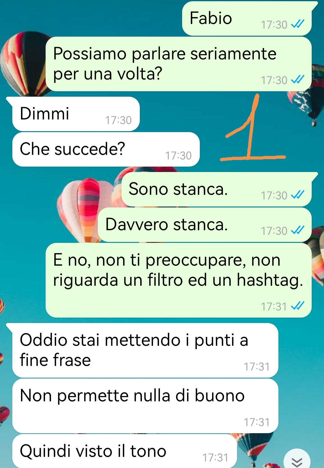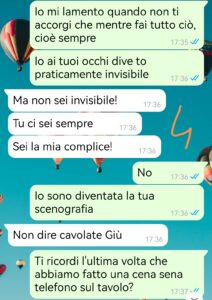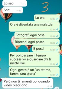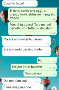 “C’è un momento preciso in cui ho capito che qualcosa si era rotto: stavamo mangiando una carbonara perfetta, e lui ha detto “ferma tutto, la devo postare”. Da lì ho guardato la tavola, il telefono puntato su di me, il suo sguardo più interessato alle reazioni che alle mie risate. E mi sono detta: non voglio più essere una story. Gli ho scritto in chat, perché parlarne a voce non serviva più. Questo è il risultato. Forse non sono l’unica a sentirmi seconda… dietro a uno schermo. Spero che la mia possa essere una soluzione. C’è chi mi ha detto che ho minato la sua libertà, ma a me non pare. Voi cosa ne pensate?”