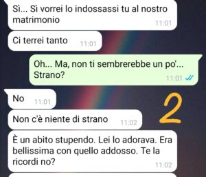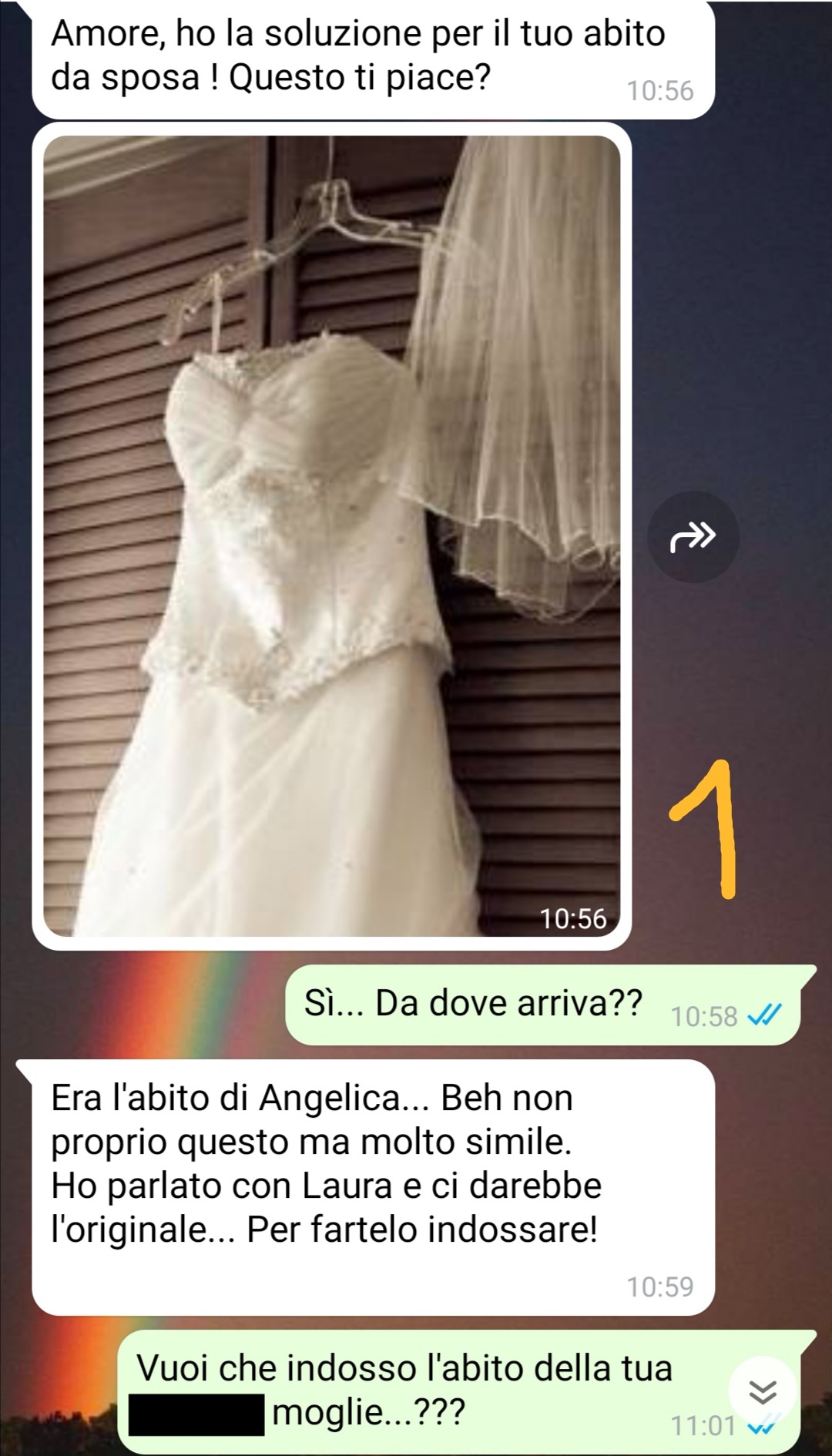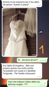 Il giorno dopo però mi manda un messaggio e mi dice che ha trovato la soluzione per l’abito da sposa. E mi allega la foto di un abito…