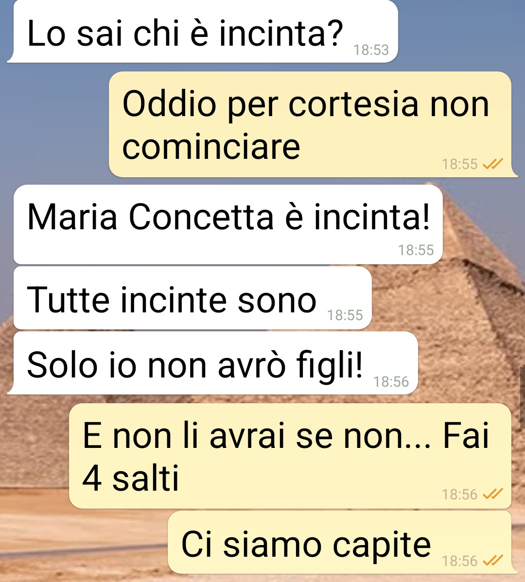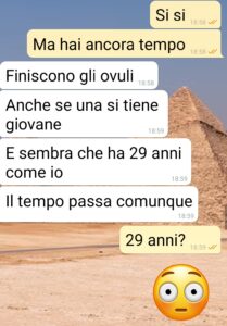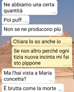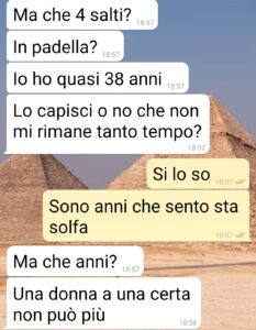 Questa è la mia amica Chiara. Dire che è particolare non rende bene. Ha 38 anni (o 37 o 39, direi che li spara a seconda dell’umore… ) e ha realizzato da un paio di anni che… il tempo corre! E a lei non ne rimane molto per avere un figlio. Bella scoperta! Fino ai 35 (o 34 o 36…) la cosa non l’ha minimamente sfiorata. Da lì, di botto, la voglia di maternità. Anzi l’urgenza impellente di maternità. E questo l’ha portata alla condizione attuale. Come dire… prima vorrebbe fare un figlio e poi cominciare a conoscere e magari amare l’uomo con cui lo ha fatto! Non mi credete? Leggete un po’ questi screen. Sono 2 anni e più che me la sorbisco ogni volta. Qualche sua conoscente è in stato interessante e lei boom: eccola puntuale con sta lagna. Ma poi tutte lei le conosce? Comunque un vero strazio, tra assurdità e ideali strampalati. Ma forse stavolta me la tolgo di mezzo con questa soluzione. Forse…”