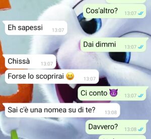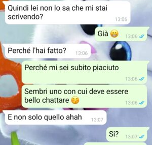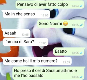 “Ciao, sono Noemi, ho 22 anni, vivo in una grande città ma ho tanti amici e amiche, mi conoscono in tanti in varie comitive, ho anche una nomea anche se a me non dispiace perché sono state le malelingue ad affibbiarmela e questo genere di persone io non me ne curo. Studio all’università, mi impegno, faccio anche un lavoro il sabato pomeriggio per evitare di gravare troppo sui miei genitori e mi ritengo una ragazza con la testa sulle spalle. Ma ciò che sono più di tutto è una vera amica, soprattutto con quelle poche che se lo meritano. Che si meritano la mia fiducia e la mia fedeltà. Leggendo questa chat potreste pensare che sia la cattiva della situazione perché, essenzialmente, ci provo con il nuovo fidanzato di una delle mie migliori amiche, Sara. Lei e Filippo si sentivano da un po’ e da un paio di mesi stanno insieme, ma io, come ho già fatto in passato con i ragazzi di altre amiche, l’ho adocchiato e ho fatto in modo di avere il suo numero e gli ho scritto. Quello che è successo dopo è stato in nome dell’amicizia, ma non vi anticipo nulla.”