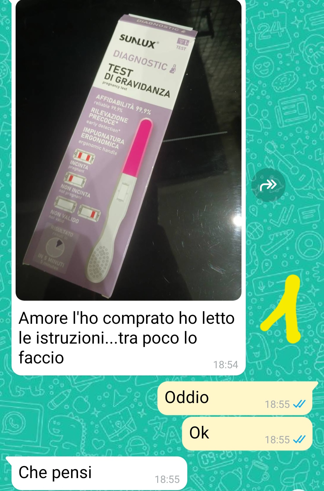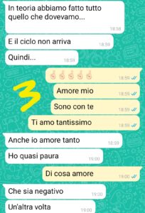 “Ciao a tutti, se posso vorrei restare anonimo. Sono un ragazzo di 31 anni e convivo da cinque anni con quella che secondo me è la donna della mia vita. Dopo diverse relazioni tossiche e sbilanciate ho conosciuto lei, che mi ha mostrato cosa significa amare davvero, senza troppe parole ma con I fatti. Lei ha 27 anni, ha un meraviglioso mondo dentro e tanta timidezza fuori. È estremamente sensibile ma non lo mostra mai. Insieme siamo felici come due bambini al parco giochi. Viviamo le nostre piccole cose con l’entusiasmo delle primissime volte, ogni giorno. Facciamo una vita semplice, fatta di lavoro, casa, qualche piccolo viaggio. Ci piace cucinare insieme, passeggiare la sera tardi con un gelato in mano e chiacchierare fino all’alba. Siamo…normali. Ma felici. E da qualche tempo abbiamo un desiderio, avere un figlio. Ci sembra naturale diventare una famiglia perché pensiamo di poter dare tanto amore. In questa chat lei aveva appena comprato un test di gravidanza e io ero al lavoro, in attesa di sapere…”