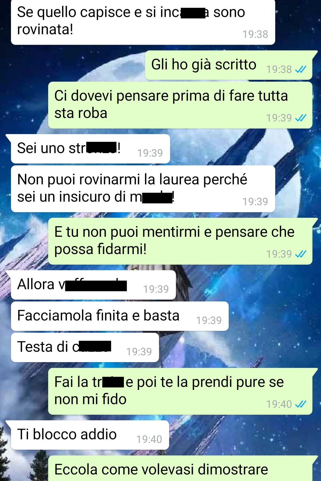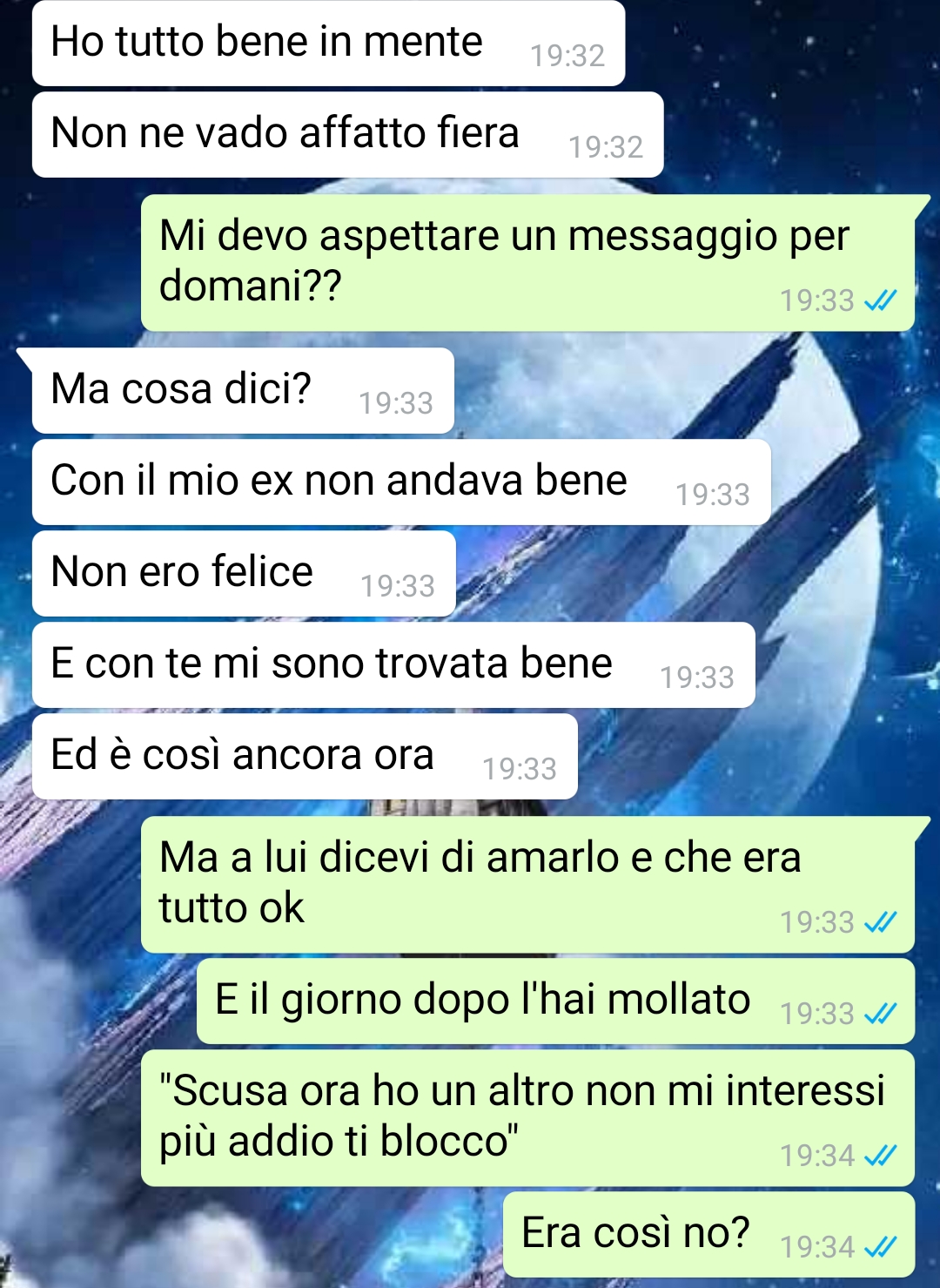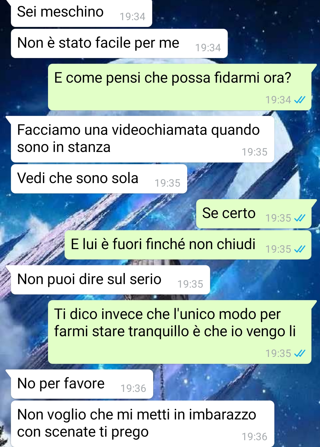 Leggi le ultime storie Non sono sola Fuga dalle feste Festività Lista regali di Natale Natale a pagamento – Finale Problemi con la privacy Il video Scelte difficili Il mio compagno Leonardo non conteso Il dilemma della sorella Un viaggio vano Bugia bianca Disorganizzazione La consumazione Outfit per il matrimonio Lui è fuggito dalla finestra La videochiamata Il tradito seriale La colf
