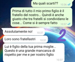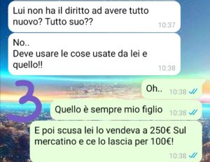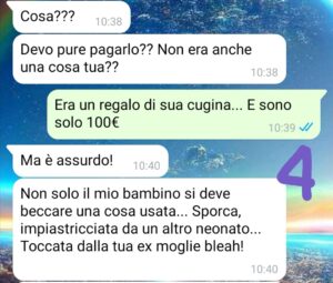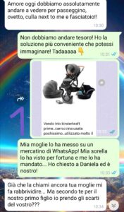 Ma non mi chiede cose di poco valore… mi chiede passeggino, ovetto… il trio insomma se non ricordo male si chiama così, dal valore di 2000€ e tante altre cose! Ogni giorno mi manda liste infinite di cose da comprare. Io sinceramente economicamente non ce la faccio. Ho un altro bambino da crescere che ha bisogno di tante cose. Pago gli alimenti…
