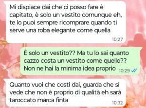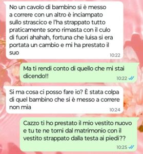 “Ciao Spunte Blu, mi sento di scrivervi due righe perché in questo istante sono piena di rabbia e follia che potrei veramente fare fuori qualcuno. Una settimana fa una mia amica che evidentemente non ci sta con la testa mi ha chiesto un grosso favore in merito ad un matrimonio a cui doveva partecipare, io ho acconsentito al favore che lei mi ha chiesto pur tra mille raccomandazioni del caso visto che la conoscono bene e so che può combinare grossi casini. Il matrimonio si è svolto ieri, oggi la contatto e come volevasi dimostrare mi ha combinato un casino gravissimo e quel che è peggio è che adesso non ne vuole sapere di rimediare. Vi chiedo di leggere la mia chat, sto veramente per esplodere dalla rabbia ma ora questa cara amica se la dovrà vedere con me ve lo posso giurare…”